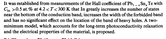 It was established from measurements of the Hall coefficient of Pbj _ x Snx Те with CIn >0.5 at.% at 4.2 < T< 300 К that In greatly increases the number of states near the bottom of the conduction band, increases the width of the forbidded band and has no significant effect on the location of the band of heavy holes. A two-minimum model, which accounts for the long-term photoconductivity relaxation and the electrical properties of the material, is proposed.