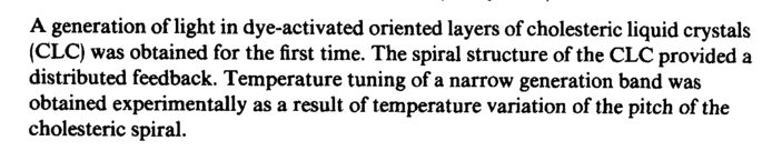 A generation of light in dye-activated oriented layers of cholesteric liquid crystals (CLC) was obtained for the first time. The spiral structure of the CLC provided a distributed feedback. Temperature tuning of a narrow generation band was obtained experimentally as a result of temperature variation of the pitch of the cholesteric spiral.