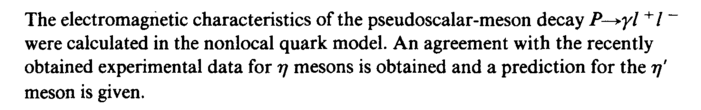 The electromagnetic characteristics of the pseudoscalar-meson decay Ρ—>γΙ +l were calculated in the nonlocal quark model. An agreement with the recently obtained experimental data for η mesons is obtained and a prediction for the η' meson is given.