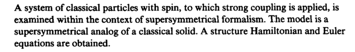 A system of classical particles with spin, to which strong coupling is applied, is examined within the context of supersymmetrical formalism. The model is a supersymmetrical analog of a classical solid. A structure Hamiltonian and Euler equations are obtained.