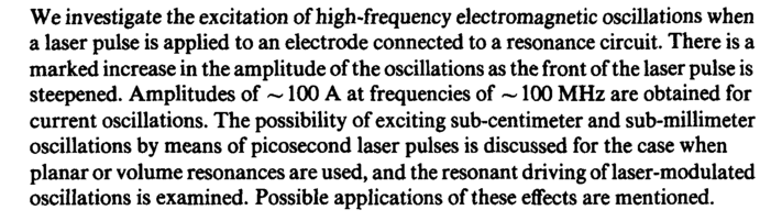 We investigate the excitation of high-frequency electromagnetic oscillations when a laser pulse is applied to an electrode connected to a resonance circuit. There is a marked increase in the amplitude of the oscillations as the front of the laser pulse is steepened. Amplitudes of ~100 A at frequencies of ~100 MHz are obtained for current oscillations. The possibility of exciting sub-centimeter and sub-millimeter oscillations by means of picosecond laser pulses is discussed for the case when planar or volume resonances are used, and the resonant driving of laser-modulated oscillations is examined. Possible applications of these effects are mentioned.