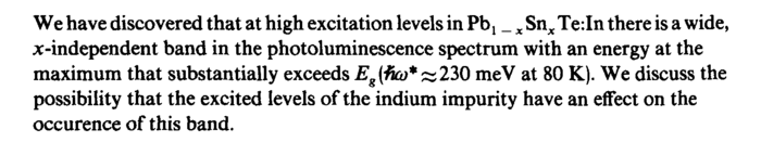 We have discovered that at high excitation levels in Fbx _ x Snx Te:In there is a wide, x-independent band in the photoluminescence spectrum with an energy at the maximum that substantially exceeds Eg(iko* ^230 meV at 80 K). We discuss the possibility that the excited levels of the indium impurity have an effect on the occurence of this band.
