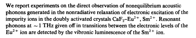 We report experiments on the direct observation of nonequilibrium acoustic phonons generated in the nonradiative relaxation of electronic excitation of the impurity ions in the doubly activated crystals CaF2-Eu2+, Sm2+. Resonant phonons at ~ 1 THz given off in transitions between the electronic levels of the Eu2+ ion are detected by the vibronic luminescence of the Sm2+ ion.