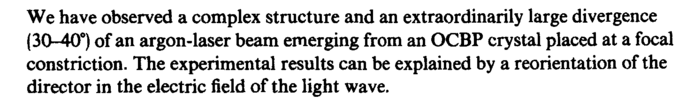 We have observed a complex structure and an extraordinarily large divergence (30-40°) of an argon-laser beam emerging from an OCBP crystal placed at a focal constriction. The experimental results can be explained by a reorientation of the director in the electric field of the light wave.