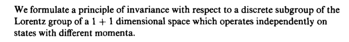 We formulate a principle of invariance with respect to a discrete subgroup of the Lorentz group of a 1 + 1 dimensional space which operates independently on states with different momenta.