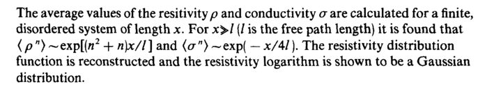 The average values of the resitivity ρ and conductivity σ are calculated for a finite, disordered system of length x. For x>/ (/ is the free path length) it is found that exp[(«2 + n)x/l] and (σ") ~ exp( — x/M). The resistivity distribution function is reconstructed and the resistivity logarithm is shown to be a Gaussian distribution.