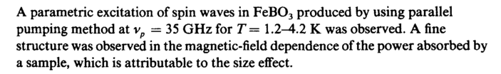 A parametric excitation of spin waves in FeB03 produced by using parallel pumping method at vp = 35 GHz for T= 1.2-4.2 К was observed. A fine structure was observed in the magnetic-field dependence of the power absorbed by a sample, which is attributable to the size effect.