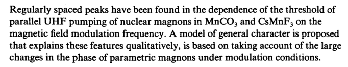 Regularly spaced peaks have been found in the dependence of the threshold of parallel UHF pumping of nuclear magnons in MnC03 and CsMnF3 on the magnetic field modulation frequency. A model of general character is proposed that explains these features qualitatively, is based on taking account of the large changes in the phase of parametric magnons under modulation conditions.