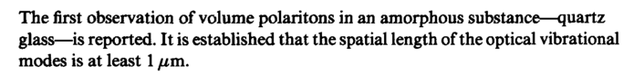 The first observation of volume polaritons in an amorphous substance—quartz glass—is reported. It is established that the spatial length of the optical vibrational modes is at least 1 μιτι.