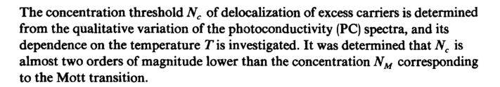 The concentration threshold Nc of delocalization of excess carriers is determined from the qualitative variation of the photoconductivity (PC) spectra, and its dependence on the temperature Γ is investigated. It was determined that Nc is almost two orders of magnitude lower than the concentration NM corresponding to the Mott transition.