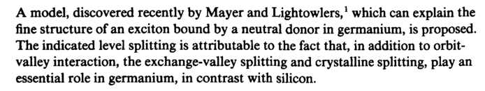 A model, discovered recently by Mayer and Lightowlers,1 which can explain the fine structure of an exciton bound by a neutral donor in germanium, is proposed. The indicated level splitting is attributable to the fact that, in addition to orbit-valley interaction, the exchange-valley splitting and crystalline splitting, play an essential role in germanium, in contrast with silicon.
