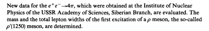 New data for the Å^Å~^4ÔÇÕ which were obtained at the Institute of Nuclear Physics of the USSR Academy of Sciences, Siberian Branch, are evaluated. The mass and the total lepton widths of the first excitation of a ρ meson, the so-called /?'(1250) meson, are determined.