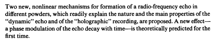 Two new, nonlinear mechanisms for formation of a radio-frequency echo in different powders, which readily explain the nature and the main properties of the "dynamic" echo and of the "holographic" recording, are proposed. A new effect— a phase modulation of the echo decay with time—is theoretically predicted for the first time.