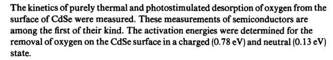 The kinetics of purely thermal and photostimulated desorption of oxygen from the surface of CdSe were measured. These measurements of semiconductors are among the first of their kind. The activation energies were determined for the removal of oxygen on the CdSe surface in a charged (0.78 eV) and neutral (0.13 eV) state.
