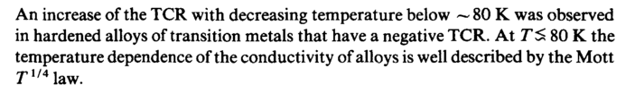 An increase of the TCR with decreasing temperature below ~ 80 К was observed in hardened alloys of transition metals that have a negative TCR. At Τ S 80 К the temperature dependence of the conductivity of alloys is well described by the Mott Τ1/4 law.