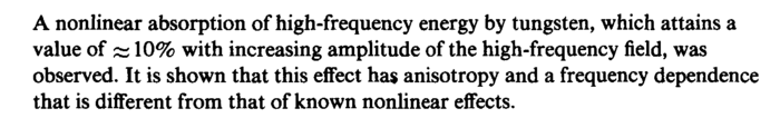 A nonlinear absorption of high-frequency energy by tungsten, which attains a value of ^ 10% with increasing amplitude of the high-frequency field, was observed. It is shown that this effect has anisotropy and a frequency dependence that is different from that of known nonlinear effects.
