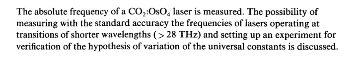 The absolute frequency of a C02:Os04 laser is measured. The possibility of measuring with the standard accuracy the frequencies of lasers operating at transitions of shorter wavelengths (> 28 THz) and setting up an experiment for verification of the hypothesis of variation of the universal constants is discussed.