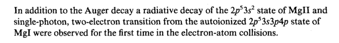 In addition to the Auger decay a radiative decay of the 2/>53s2 state of Mgll and single-photon, two-electron transition from the autoionized 2p53s3p4p state of Mgl were observed for the first time in the electron-atom collisions.