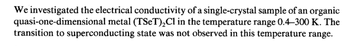 We investigated the electrical conductivity of a single-crystal sample of an organic quasi-one-dimensional metal (TSeT)2Cl in the temperature range 0.4-300 K. The transition to superconducting state was not observed in this temperature range.