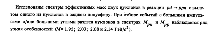 Исследованы спектры эффективных масс двух цуклонов в реакции pd -*■ ррп с вылетом одного из нуклонов в заднюю полусферу. При отборе событий с большими импульсами и/или большими углами разлета нуклонов в спектрах М^п и Μ наблюдается ряд узких особенностей (М= 1,95; 2,03; 2,08 и 2,14 ГэВ/с2).