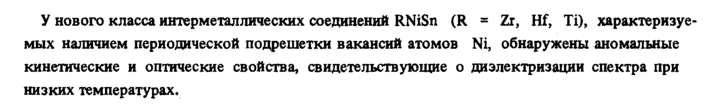 У нового класса интерметаллических соединений RNiSn (R = Zr, Hf, Ti), характеризуе мых наличием периодической подрешетки вакансий атомов Ni, обнаружены аномальные кинетические и оптические свойства, свидетельствующие о диэлектризации спектра при низких температурах.
