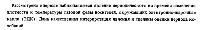 Рассмотрено впервые наблюдавшееся явление периодического во времени изменения плотности и температуры газовой фазы носителей, окружающих электронно-дырочные капли (ЭДК). Дана качественная интерпретация явления и сделаны оценки периода колебаний.
