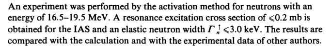 An experiment was performed by the activation method for neutrons with an energy of 16.5-19.5 MeV. A resonance excitation cross section of <0.2 mb is obtained for the IAS and an elastic neutron width ΓI <3.0 keV. The results are compared with the calculation and with the experimental data of other authors.