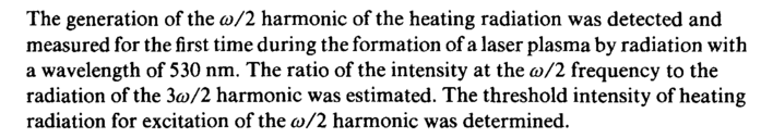 The generation of the ω/2 harmonic of the heating radiation was detected and measured for the first time during the formation of a laser plasma by radiation with a wavelength of 530 nm. The ratio of the intensity at the ω/2 frequency to the radiation of the Ъω/2 harmonic was estimated. The threshold intensity of heating radiation for excitation of the ω/2 harmonic was determined.