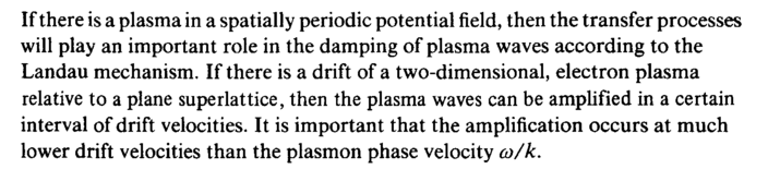 If there is a plasma in a spatially periodic potential field, then the transfer processes will play an important role in the damping of plasma waves according to the Landau mechanism. If there is a drift of a two-dimensional, electron plasma relative to a plane superlattice, then the plasma waves can be amplified in a certain interval of drift velocities. It is important that the amplification occurs at much lower drift velocities than the plasmon phase velocity ω/k.