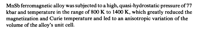 MnSb ferromagnetic alloy was subjected to a high, quasi-hydrostatic pressure of 77 kbar and temperature in the range of 800 К to 1400 K, which greatly reduced the magnetization and Curie temperature and led to an anisotropic variation of the volume of the alloy's unit cell.