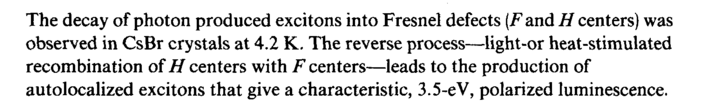 The decay of photon produced excitons into Fresnel defects (Fand Η centers) was observed in CsBr crystals at 4.2 K. The reverse process—light-or heat-stimulated recombination of Η centers with F centers—leads to the production of autolocalized excitons that give a characteristic, 3.5-eV, polarized luminescence.
