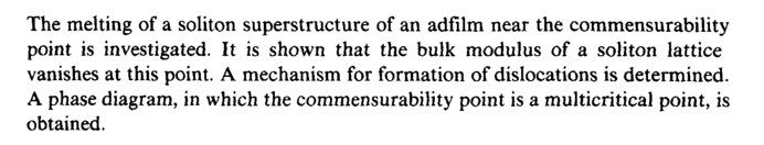 The melting of a soliton superstructure of an adfilm near the commensurability point is investigated. It is shown that the bulk modulus of a soliton lattice vanishes at this point. A mechanism for formation of dislocations is determined. A phase diagram, in which the commensurability point is a multicritical point, is obtained.