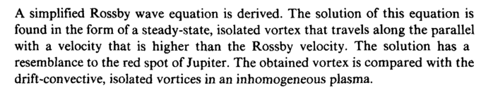 A simplified Rossby wave equation is derived. The solution of this equation is found in the form of a steady-state, isolated vortex that travels along the parallel with a velocity that is higher than the Rossby velocity. The solution has a resemblance to the red spot of Jupiter. The obtained vortex is compared with the drift-convective, isolated vortices in an inhomogeneous plasma.