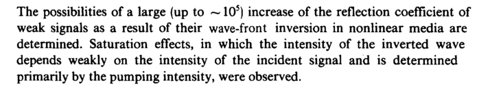 The possibilities of a large (up to —105) increase of the reflection coefficient of weak signals as a result of their wave-front inversion in nonlinear media are determined. Saturation effects, in which the intensity of the inverted wave depends weakly on the intensity of the incident signal and is determined primarily by the pumping intensity, were observed.