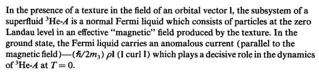 In the presence of a texture in the field of an orbital vector 1, the subsystem of a superfluid 3He-A is a normal Fermi liquid which consists of particles at the zero Landau level in an effective "magnetic" field produced by the texture. In the ground state, the Fermi liquid carries an anomalous current (parallel to the magnetic field)—(#/2m3) pi (1 curl 1) which plays a decisive role in the dynamics of3He-^atr=0.