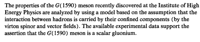 The properties of the G( 1590) meson recently discovered at the Institute of High Energy Physics are analyzed by using a model based on the assumption that the interaction between hadrons is carried by their confined components (by the virion spinor and vector fields). The available experimental data support the assertion that the G( 1590) meson is a scalar gluonium.