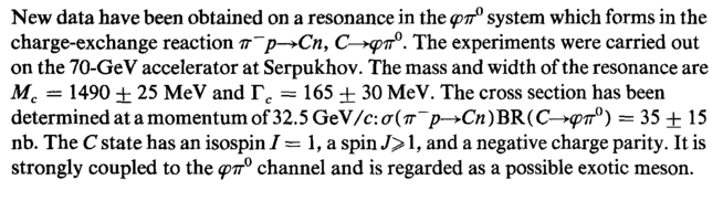 New data have been obtained on a resonance in the φπ° system which forms in the charge-exchange reaction ir~p—*Cn, The experiments were carried out on the 70-GeV accelerator at Serpukhov. The mass and width of the resonance are Mc = 1490 ± 25 MeV and Гс = 165 ± 30 MeV. The cross section has been determined atamomentumof32.5GeV/c:a(77-_/?~>C/i)BR(C-^7r°) = 35+15 nb. The С state has an isospin / = 1, a spin J> 1, and a negative charge parity. It is strongly coupled to the φπ° channel and is regarded as a possible exotic meson.