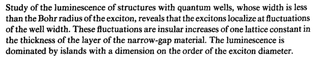 Study of the luminescence of structures with quantum wells, whose width is less than the Bohr radius of the exciton, reveals that the excitons localize at fluctuations of the well width. These fluctuations are insular increases of one lattice constant in the thickness of the layer of the narrow-gap material. The luminescence is dominated by islands with a dimension on the order of the exciton diameter.