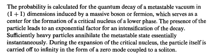 The probability is calculated for the quantum decay of a metastable vacuum in (I + I) dimensions induced by a massive boson or fermion, which serves as a center for the formation of a critical nucleus of a lower phase. The presence of the particle leads to an exponential factor for an intensification of the decay. Sufficiently heavy particles annihilate the metastable state essentially instantaneously. During the expansion of the critical nucleus, the particle itself is carried off to infinity in the form of a zero mode coupled to a soliton.