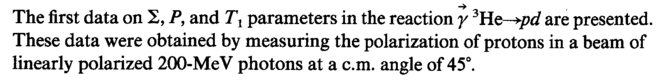 The first data on Σ, P, and T1 parameters in the reaction γ 3He—are presented. These data were obtained by measuring the polarization of protons in a beam of linearly polarized 200-MeV photons at a cm. angle of 45°.
