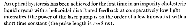 An optical hysteresis has been achieved for the first time in an impurity cholesteric liquid crystal with a helicoidal distributed feedback at comparatively low light intensities (the power of the laser pump is on the order of a few kilowatts) with a short time constant (the pulse length is r^8 ns).