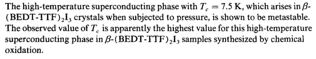 The high-temperature superconducting phase with Tc = 7.5 K, which arises in β-(BEDT-TTF)2I3 crystals when subjected to pressure, is shown to be metastable. The observed value of Tc is apparently the highest value for this high-temperature superconducting phase in /?-(BEDT-TTF)2I3 samples synthesized by chemical oxidation.