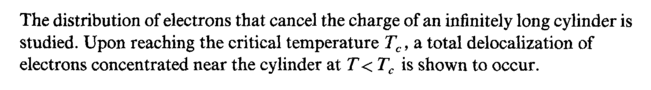 The distribution of electrons that cancel the charge of an infinitely long cylinder is studied. Upon reaching the critical temperature Tci a total derealization of electrons concentrated near the cylinder at T< Tc is shown to occur.