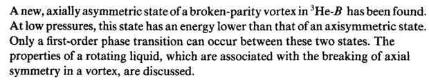 A new, axially asymmetric state of a broken-parity vortex in 3He~B has been found. At low pressures, this state has an energy lower than that of an axisymmetric state. Only a first-order phase transition can occur between these two states. The properties of a rotating liquid, which are associated with the breaking of axial symmetry in a vortex, are discussed.