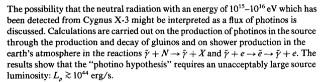 The possibility that the neutral radiation with an energy of 1015-1016 eV which has been detected from Cygnus X-3 might be interpreted as a flux of photinos is discussed. Calculations are carried out on the production of photinos in the source through the production and decay of gluinos and on shower production in the earth's atmosphere in the reactions γ + N —> γ + X and γ + e -+e-+f + e. The results show that the "photino hypothesis" requires an unacceptably large source luminosity: Lp £ 1044 erg/s.
