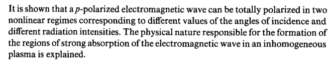 It is shown that a ^-polarized electromagnetic wave can be totally polarized in two nonlinear regimes corresponding to different values of the angles of incidence and different radiation intensities. The physical nature responsible for the formation of the regions of strong absorption of the electromagnetic wave in an inhomogeneous plasma is explained.