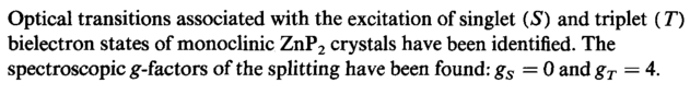 Optical transitions associated with the excitation of singlet (5) and triplet (T) bielectron states of monoclinic ZnP2 crystals have been identified. The spectroscopic g-factors of the splitting have been found: gs = 0 and gT = 4.