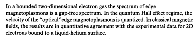 In a bounded two-dimensional electron gas the spectrum of edge magnetoplasmons is a gap-free spectrum. In the quantum Hall effect regime, the velocity of the "optical"edge magnetoplasmons is quantized. In classical magnetic fields, the results are in quantitative agreement with the experimental data for 2D electrons bound to a liquid-helium surface.