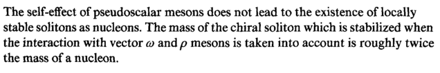 The self-effect of pseudoscalar mesons does not lead to the existence of locally stable solitons as nucleons. The mass of the chiral soliton which is stabilized when the interaction with vector ω and ρ mesons is taken into account is roughly twice the mass of a nucleon.