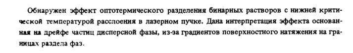 Обнаружен эффект оптотермического разделения бинарных растворов с нижней критической температурой расслоения в лазерном пучке. Дана интерпретация эффекта основанная на дрейфе частиц дисперсной фазы, из-за градиентов поверхностного натяжения на границах раздела фаз.